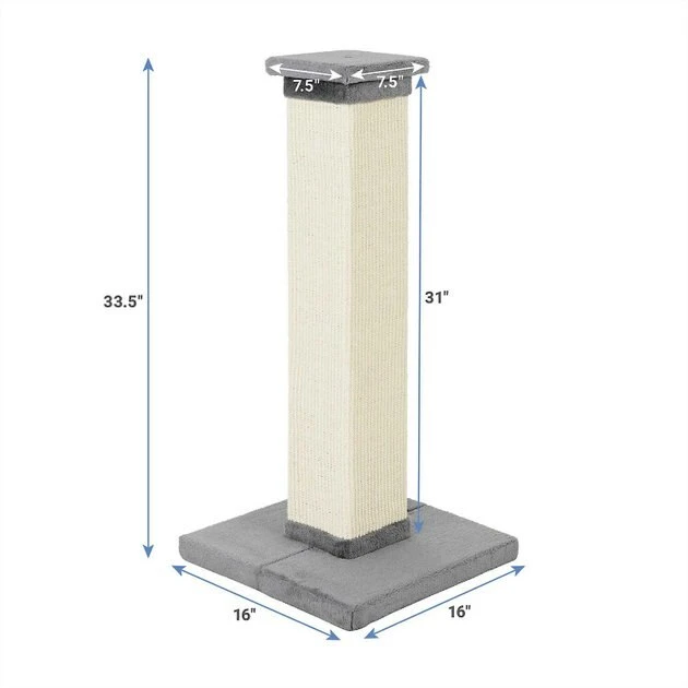 - This 33.5-inch vertical tower is the ideal height for stretching and provides a perch that’s high off the ground so they can keep an eye on her territory.