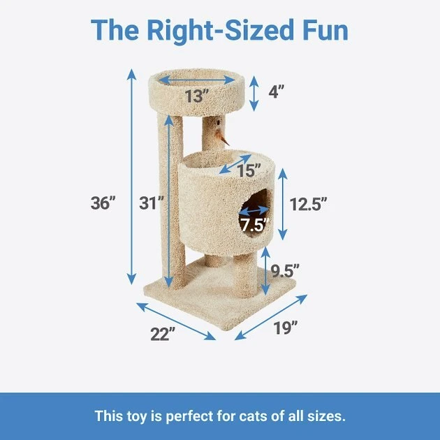 Every kitty needs a place to lounge away their lazy days. Give them a private place that’s all their own with this two-level cat tree with a private, enclosed condo and a high, round perch too! This wood-framed cat tree is covered in household-grade carpet that’s ideal for luxurious lounging, and it has a secluded, cozy condo they’ll enjoy kicking back and relaxing in too. Plus, there’s a tall, round platform at the top for them to perch on in absolute kitty comfort.