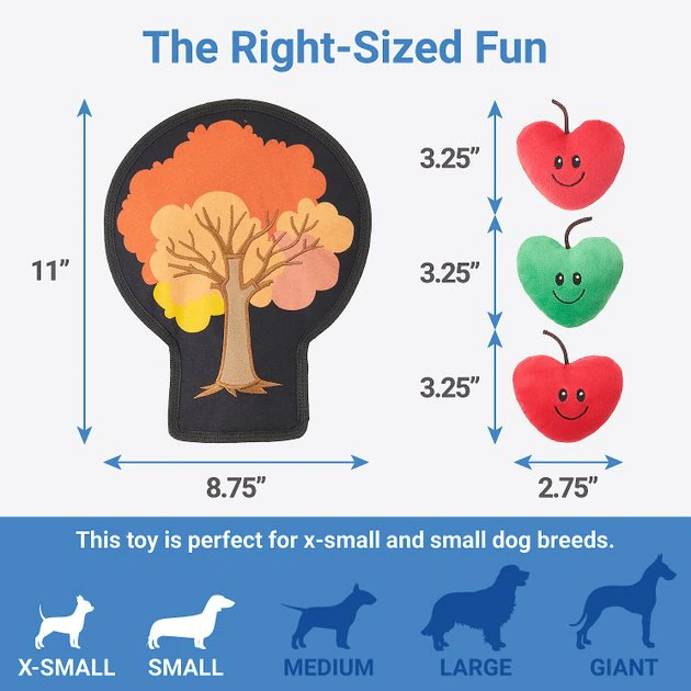 - Features crinkle paper and a total of seven squeakers in the apples and tree.