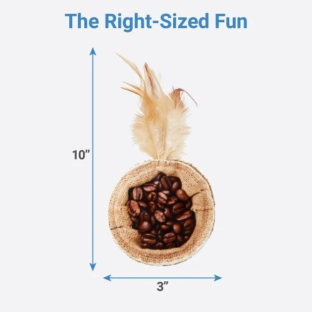 - Cute coffee bag design makes a great addition to your cat’s toy box.
