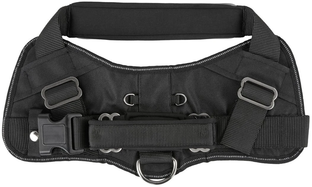 To put on harness, slip front strap around dog’s neck and padded strap under the dog’s belly. Ensure easy-clip buckles are securely fastened and adjusted for best fit.