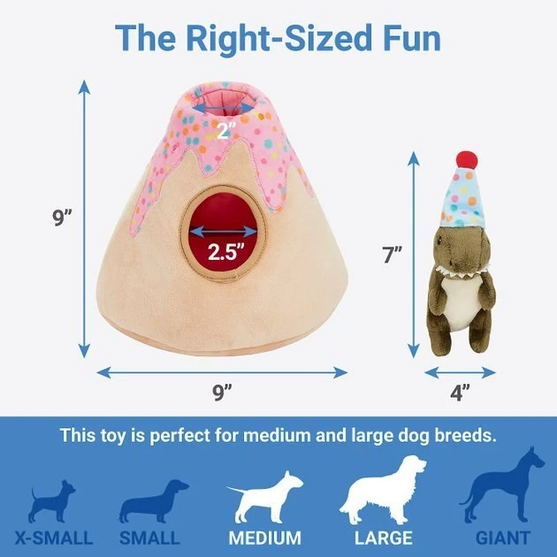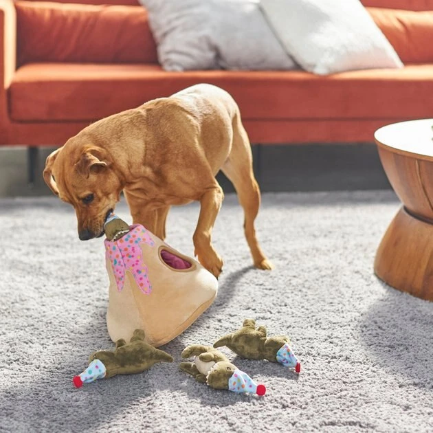 Your dog’s birthday is about to get jurassic-ally fun! This plush hide-and-seek birthday volcano toy comes with a vanilla cake volcano (with pink icing and sprinkles, of course) and individual squeaky dinosaurs in party hats your pup can burrow for. You won’t have to worry about the fun going extinct with this exciting interactive toy.
