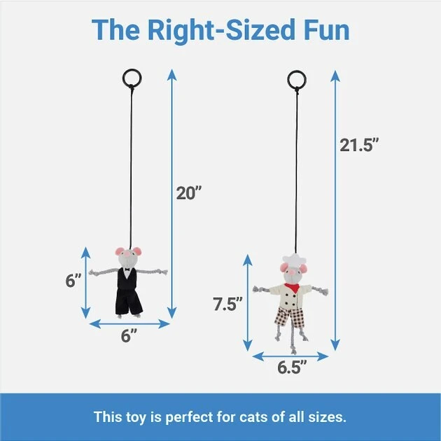 This dynamic duo is ready to make your cat’s brunch a memorable one! Your lucky kitty now has two new mice friends for double the playtime possibilities at the table, or anywhere for that matter. Featuring bouncy strings, just dangle them and watch as one chefs up some uber-delicious food for your cat, while the other makes sure that everyone at the table feels at home. Oh, and they’re also filled with catnip and crinkle paper, so that’s super exciting for your kitty cat as well! This mouse chef and waitress can do it all and can’t wait to meet your lucky cat.