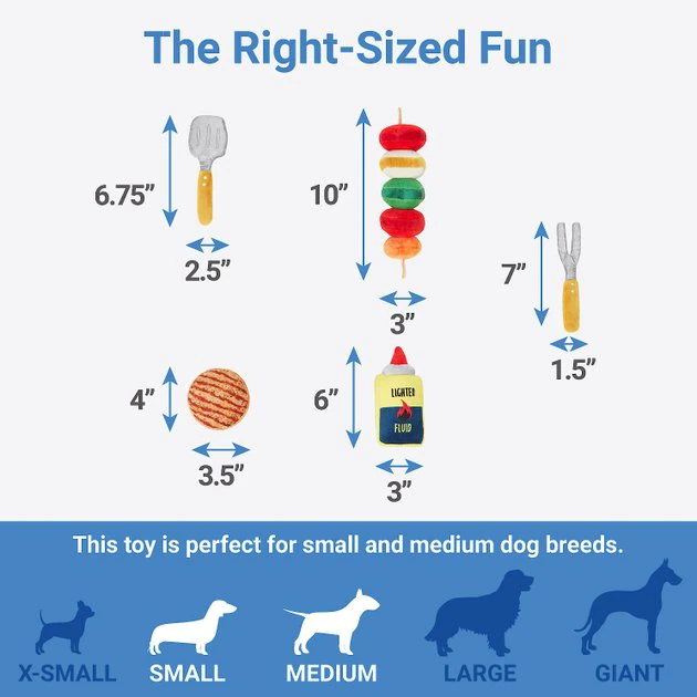 - Grilling and squeaking! Plush puzzle toy includes grill base and squeaky grilling accoutrements, with squeakers and crinkle paper inside.