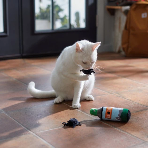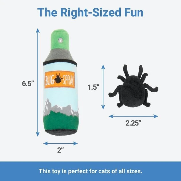 Ah, the smell of pine, the stars, and nothing but you, your kitty and the great outdoors. Oh, and this bug spray plushy filled with catnip—and the bugs that always tag along. Whether you’re prowling around the campsite or glamping on the couch, this tent-side must-have is ready to bust boredom wherever the playtime fun takes you. Made with super soft, cuddly Velboa plush, this is one toy that’s perfect for camping out or chilling in.