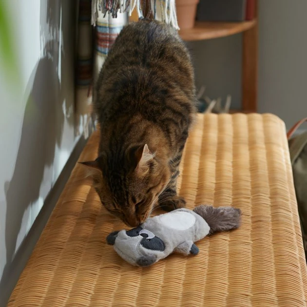 Ah, the smell of pine, the stars, and nothing but you, your kitty and the great outdoors. Oh, and this racoon kicker toy filled with catnip. Whether you’re prowling around the campsite or glamping on the couch, this tent-side must-have is ready to bust boredom wherever the playtime fun takes you. Perfectly shaped for kicking,