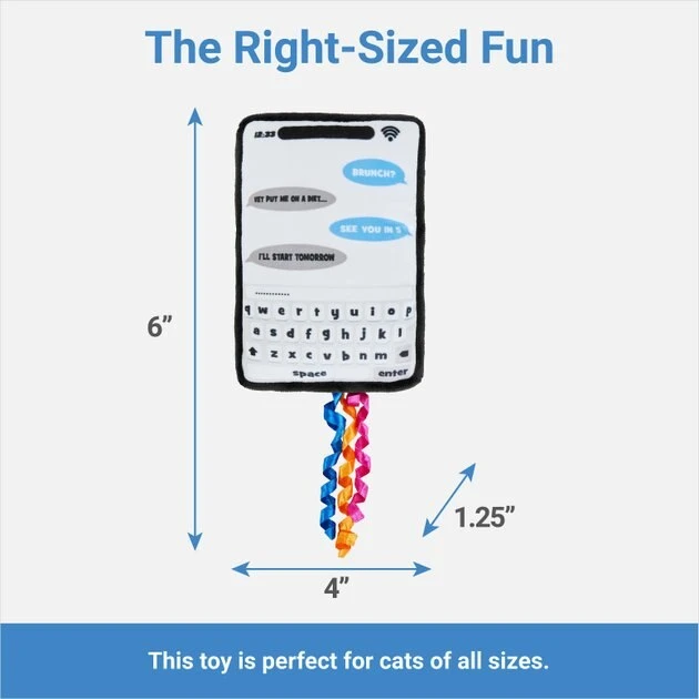 - Cellphone plush cat toy includes catnip to boost playtime and get kitty moving.