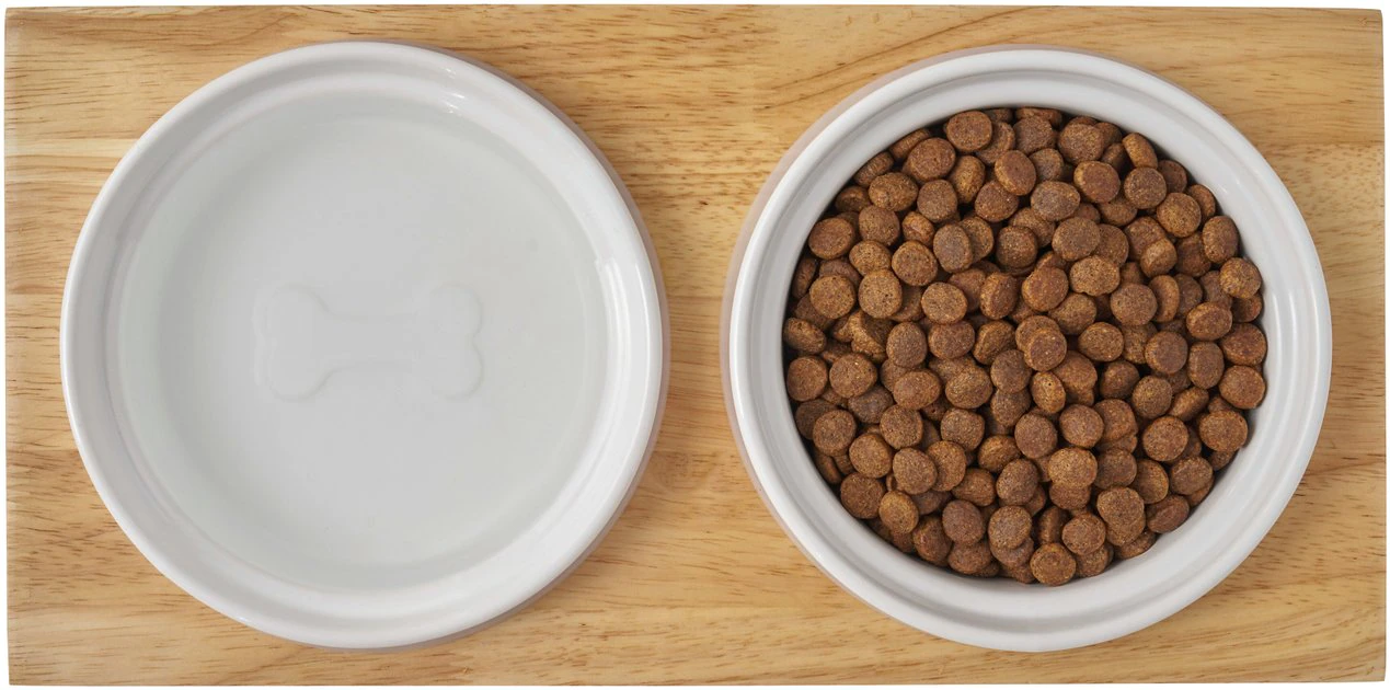 - Double diner design includes two white ceramic bowls and wooden stand.