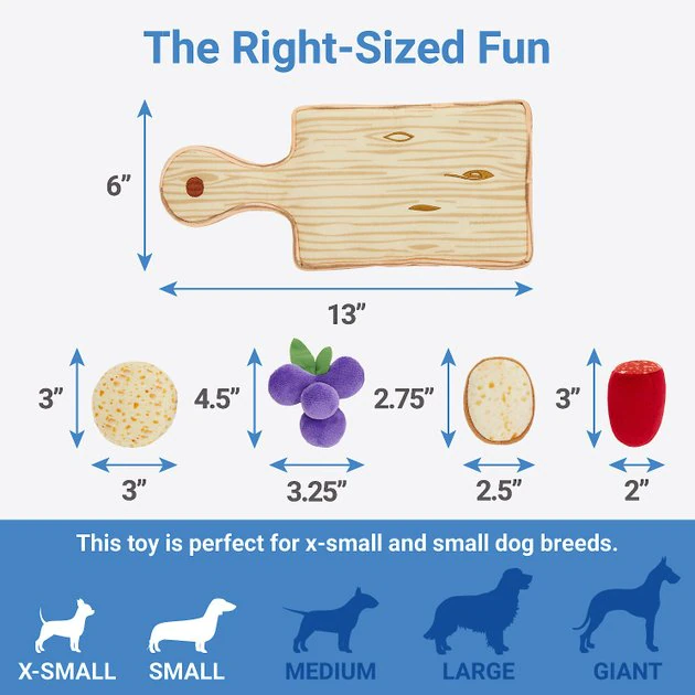 Charcuterie for your cutie? Surprise your bestie with this plush interactive charcuterie board toy. It features a plush, squeaky board with removable salami, cheese, crackers and grapes. Each removable toy has a built-in squeaker to get your pup extra excited. This squeaky snack spread is a playtime must-have!