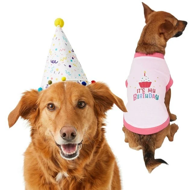 **Remember to measure your pet for the paw-fect fit. Who’s the king or queen on their special day? It’s your pup or kitty wearing the Frisco Happy Birthday Dog & Cat B-Day Crown and Frisco It’s My Birthday Dog & Cat T-Shirt bundle. This plush, sparkly golden crown is sure to turn up the fun during your pal’s special day. Think of all the adorable selfies! It’s easy to put on with the ear loops and adjustable toggle, and just flashy enough to spark some conversation too. And you bet your pet can feel extra special on their big day with the Frisco It’s My Birthday Dog & Cat T-Shirt. This lightweight t-shirt is made with a breathable cotton-polyester blend and features an adorable pink “It’s My Birthday” print. The pull-over style makes it easy to get your pet dressed—so they can be the center of attention! Plus, it’s machine washable and comes in different sizes to fit most pups and kitties.