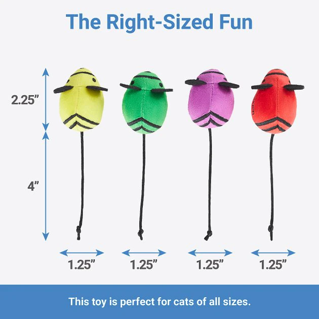 - Five plush toys in one for kitty—a crayon box and four crayon-colored mice with stringy tails.