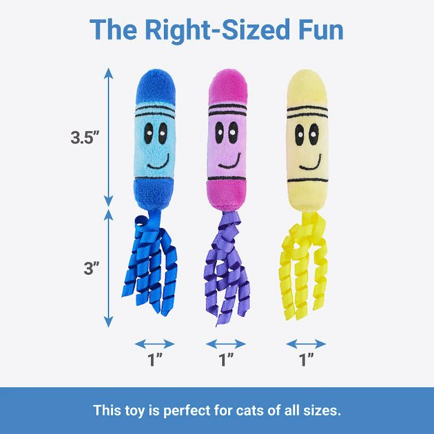 - Three plush crayon toys for kitty—yellow, purple and blue—with twisty ribbons.