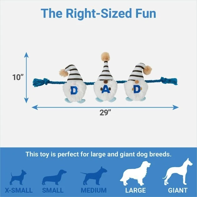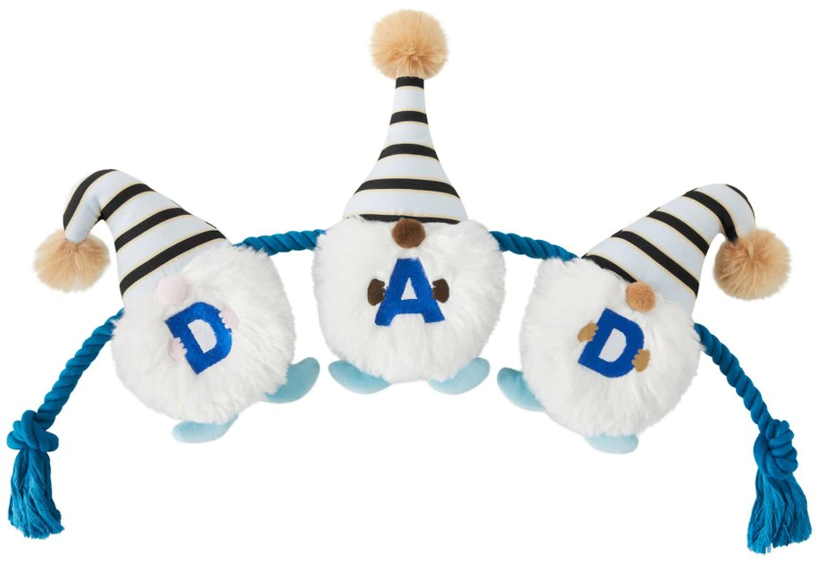 - Plush gnome rope toy features three gnomes with striped hats that spell out “DAD,” connected by a rope.