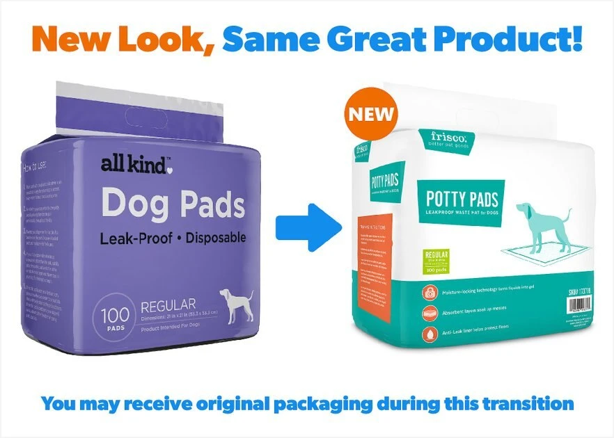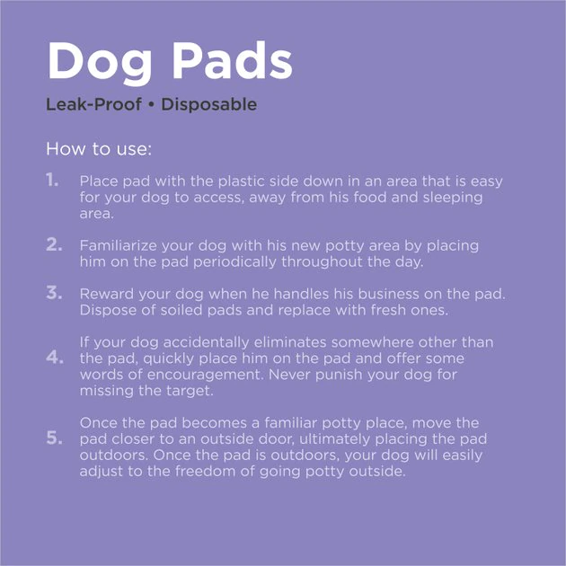 Your pup can’t always venture into the great outdoors when nature calls, but Frisco Unscented Dog Training Pads bring a little patch of what she’s looking for right into your home. With absorbent layers and moisture-locking technology, these potty pads help you train your pup to do her business exactly where you want her to, making waste clean up very easy! Plus, they’re designed with an anti-leak liner to protect your floors, and no added fragrances. When it’s time for a new pad, simply drop it in the trash and replace with a fresh one—it’s that simple! Frisco by Chewy has you covered with all the essentials for a happy pet, from poop bags to litter, apparel, toys, beds, dinnerware, leashes and collars and lots more.