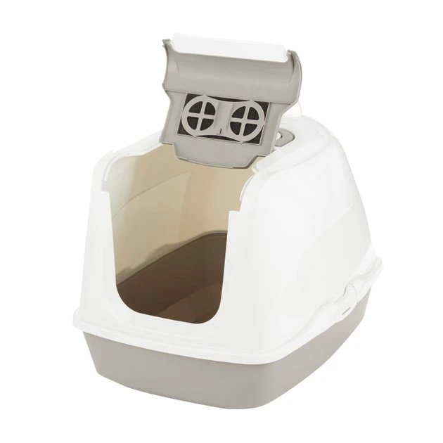 - Hooded cat litter box with hinged door provides a private spot for your cat to potty, while helping to keep dogs out.