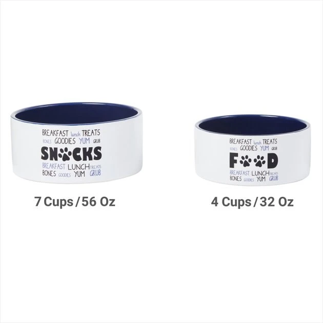 Elevate your doggie dinnerware with the Frisco Food & Paw Non-Skid Ceramic Dog Bowl! This cute bowl has fun, pet-themed graphics on the side, with “food” and paw prints. Have an excited eater who tends to make a bit of a mess at mealtime? No problem! This bowl has a non-skid bottom to help hold the bowl in place to cut down on tips and spills. Plus, it’s available in two sizes, so you can find the best bowl to fit your pet’s appetite.