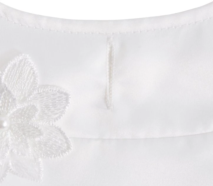 - Lovely lace floral embellishments with faux pearl beading, layered tulle skirt, and satin bow add a touch of elegance.