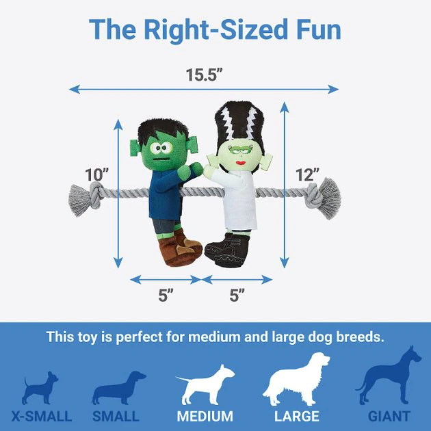 - Rope runs through Frankenstein and Bride bodies and gives pups plenty of places to grab on.