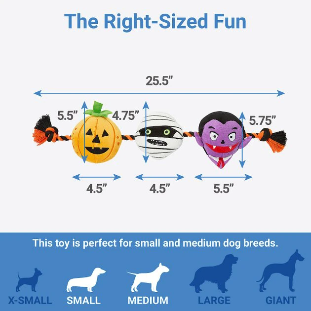 - Plush and squeaky with a rope connecting jack-o-lantern, mummy and vampire plushies.