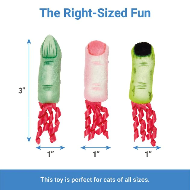 “Point” your cat towards playtime with the Frisco Plush Finger Cat Toy, 3-Count. Three creepy cute fingers means triple the frightening fun. Each finger features catnip, crinkle paper, and ribbon to take your cat’s play session to new heights–No levitation spell required!