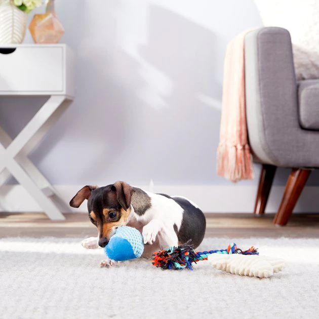 - Comes with plush squeaky ball, plush squeaky bone and rope toy.