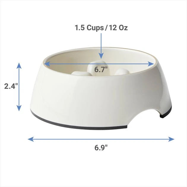 - Slow-feed design with raised columns inside the bowl helps fast eaters slow down.