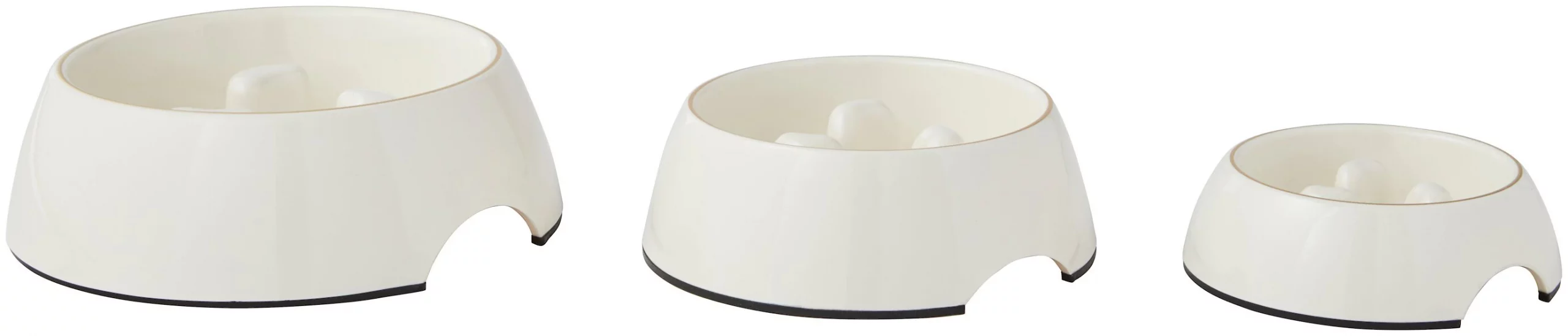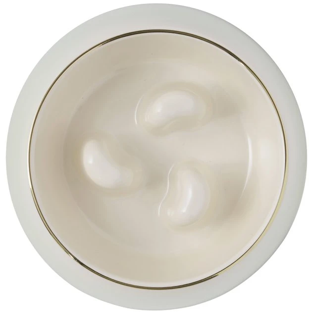 - Cream-colored melamine slow feeder with a tasteful gold trim accent.