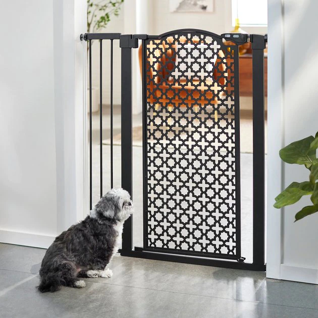Check out the Size tab to be sure this gate fits your doorway. Turn any room in your home into an extra-tall-pet safe zone with the Frisco Metal Pattern Extra Tall Auto-Close Pet Gate. With its durable, metal construction, this gate is designed to keep your pet—especially your large or giant breed dog—safely contained; and with its cool, geometric pattern, it’s sure to make a stylish addition to your home. Simply install it in a door frame or hallway to provide your pet with a place all their own. The pressure mount system makes setting it up and taking it down easy, so you can move it to different areas of the house as needed. The gate door works double duty by staying open when you need it to—just open it past 90 degrees to lock it open—or otherwise closing on its own. You can also set up the door to open on either side. The dual-lock safety release means your pal can’t get crafty and open the door, adding a layer of security. Plus, this gate is lightweight so you can transport it and store it easily.