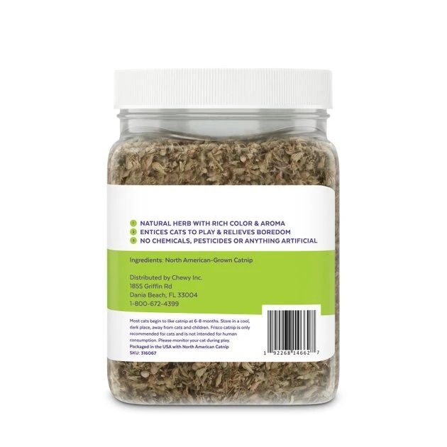 The tempting aroma of Frisco Natural Catnip will bring out the playful pet in every kitty! This 100% natural blend of leaves and flower tops—grown in North America for optimal potency, the richest color and strongest aroma—will entice any cat to pounce and play for hours and hours. Just pop off the top and your cat will come running, ready for all the feline fun.