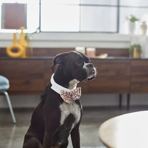 Get your pup or kitty ready to make a fashion statement with the Frisco Plaid Dog & Cat Bow Tie. It goes on with a hook-and-loop fastener around your pal’s neck for that polished look, plus the orange and blue plaid pattern gives your pet adorable dapper vibes. The white collar makes it look so realistic, too. It also comes in two sizes with a wide fastener so you can adjust it for the right fit.