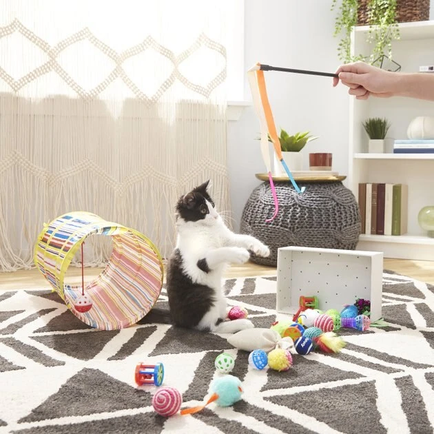 - Provides a variety of play options with the classic toys cats love, including toys filled with catnip, fuzzy mice, crinkly pom-poms, rolling balls, wand and play tunnel.