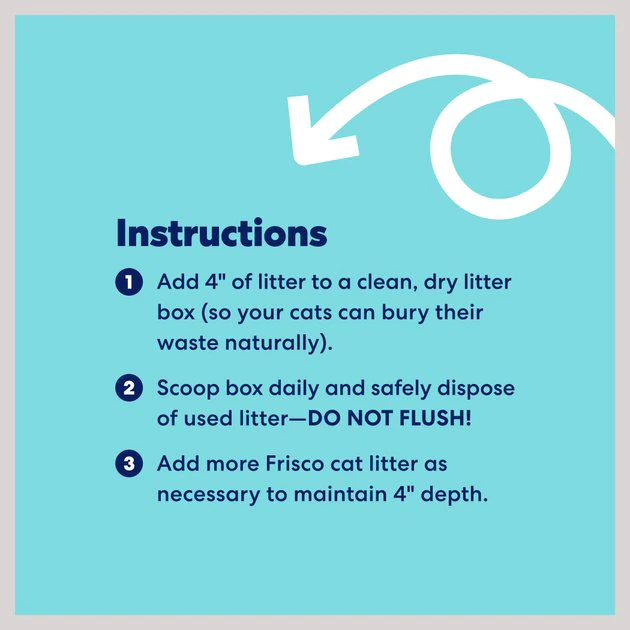 - Add approximately 4 inches of Frisco cat litter to a clean, dry litter box (this allows your cats to dig and cover their waste naturally).
