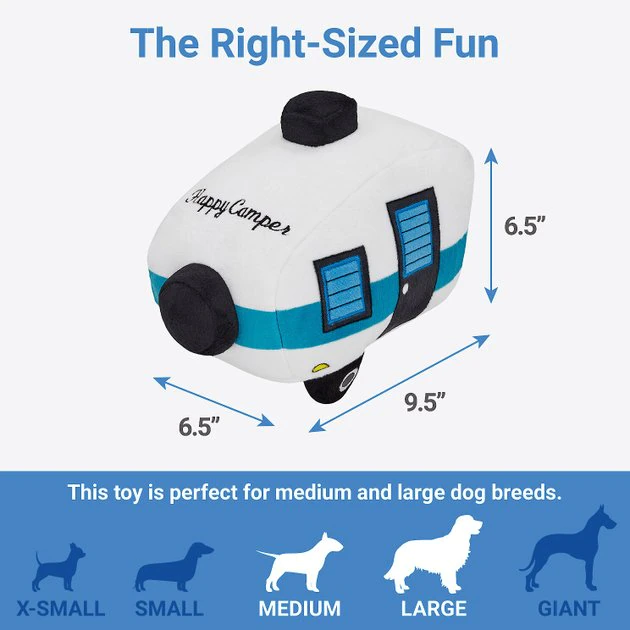 Take playtime on the road with the Frisco Road Trip Happy Camper Plush Squeaky Dog Toy! This camper plush squeaky toy is perfect for a game of fetch, plus it features four built-in squeakers for extra excitement. Choose from medium or large to find the perfect size for your happy camper.