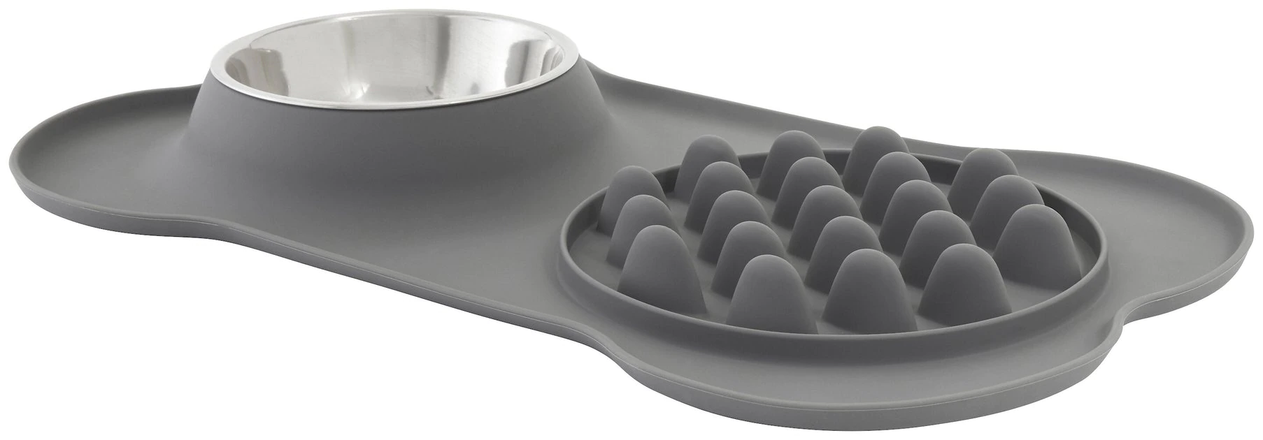 Is your dog a speed eater at meal time? The Frisco Silicone Slow Feeder Mat with Stainless Steel Bowl is an all-in-one solution to promote slower eating for your pup. This silicone mat features raised edges to prevent food and water from spilling over. Plus, the removable stainless steel bowl is top-rack dishwasher safe for easy cleaning so it can always be ready for your canine companion.