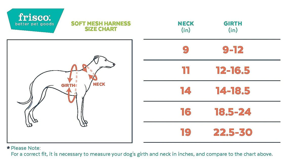 The Frisco soft vest dog harness is designed specifically for small dogs, the soft mesh harness is perfect for medium-to-small breed pups while the padded front lead harness is a great option for medium and large breed dogs. Remember: the Frisco harness is designed specifically to fit certain size breeds. For the correct fit, please make sure to measure your dog’s girth in inches and compare to our size chart.