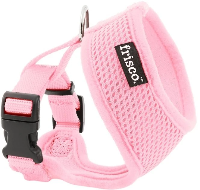 Remember to measure your pet for the paw-fect fit. The Frisco Soft Mesh Dog Harness provides pet parents with a soft, easy-to-use harness. Made with breathable mesh material, this harness will help your pet stay comfy and cool while out on their everyday walks. The over-the-head design and fast-release buckle make it easy to get on and off, while the adjustable slide on the belly strap ensures that you get the perfect fit to keep your pup secure. The D-ring at the back of the harness is secured using durable nylon fabric for you to attach your leash to, so you will always feel in control. This soft mesh dog harness comes in sizes from small to extra-large, and in four different colors—pink, red, blue and black—so you can choose the one that best suits your pup and their style.