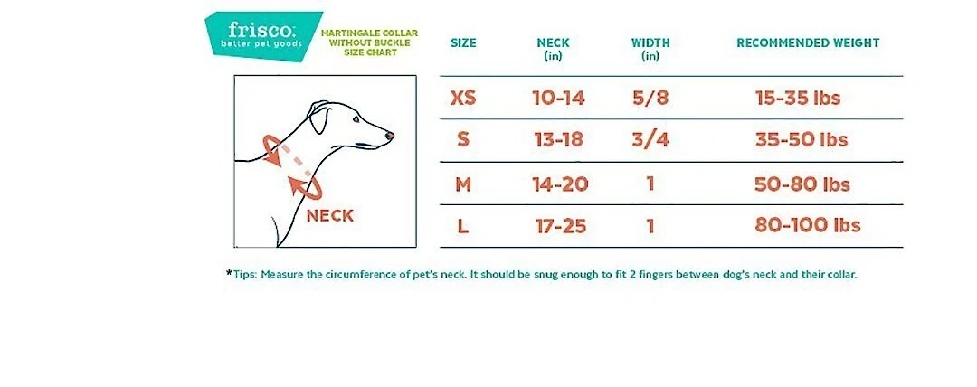 Remember to measure your pet for the paw-fect fit. The Frisco Solid Martingale Dog Collar is the perfect solution for the “Houdini” canines that easily slip out of their collars. It features a comfortable yet snug design that lets both you and your pup enjoy daily walks. Made without a buckle, this martingale collar has two loops and gently slides over your pet’s head when she’s ready to go out. The first loop acts as a traditional collar that has an adjustable slide. The second loop provides extra control, so if your dog pulls or tries to back out of their collar, it will tighten slightly without being as restricting as a traditional choke or prong collar. It’s made with durable, high-quality nylon that comes in a variety of colors so you can find a style that complements your pup’s personality and coat. The Frisco Solid Martingale Dog Collar also has an ID ring for attaching ID tags without cluttering the leash ring. It comes in multiple sizes to fit every pup, and the nickel-coated hardware gives it a sleek and polished finish.