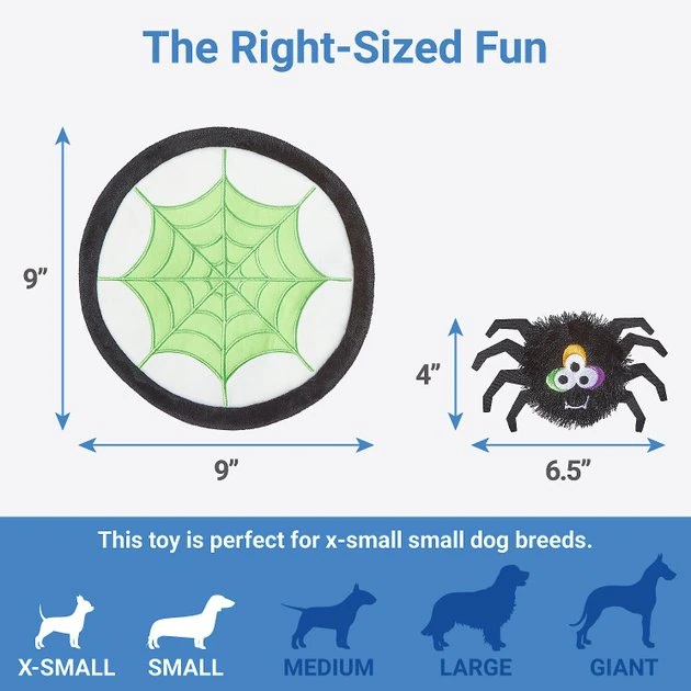 - Plush, squeaky spider web toy includes a flat spider web base and a detachable spider.