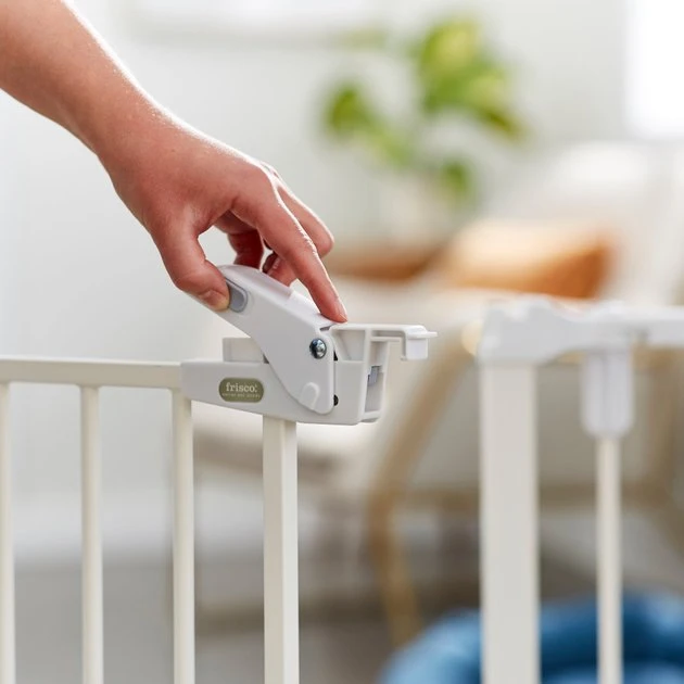 Pet containment is a breeze with a Frisco Configurable Gate! This three-panel gate is ideal for separating open spaces to create a place in your home just for your pet to roam. It’s 30-inches tall and fits spaces 35.5 to 79.5 inches wide. Unlike a pressure-mounted gate, it’s flexible and sits outside of the wall to fit doorways of different shapes and sizes. You can even widen it more by combining multiple gates to bridge bigger gaps. Its steel construction with powder-coated finish—available in white, black or gray—is durable and strong enough to keep your pet safely contained, but it’s still lightweight and portable so you can transport and store it easily when not in use. To make sure your pet stays safe and secure in their spot, this gate features a self-closing door that automatically shuts if left open less than 90° and a secure dual-lock system too. Plus, installation is easy and only requires a pencil and a screwdriver to mount it to walls.