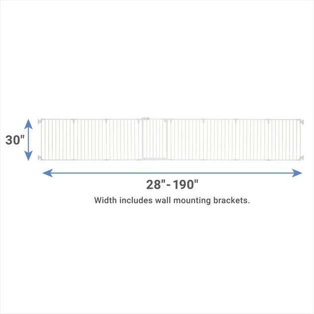 - Each panel measures 30-inches tall. The gate expands to 186.5 inches without mounting brackets. With the brackets, the gate expands to 190 inches.