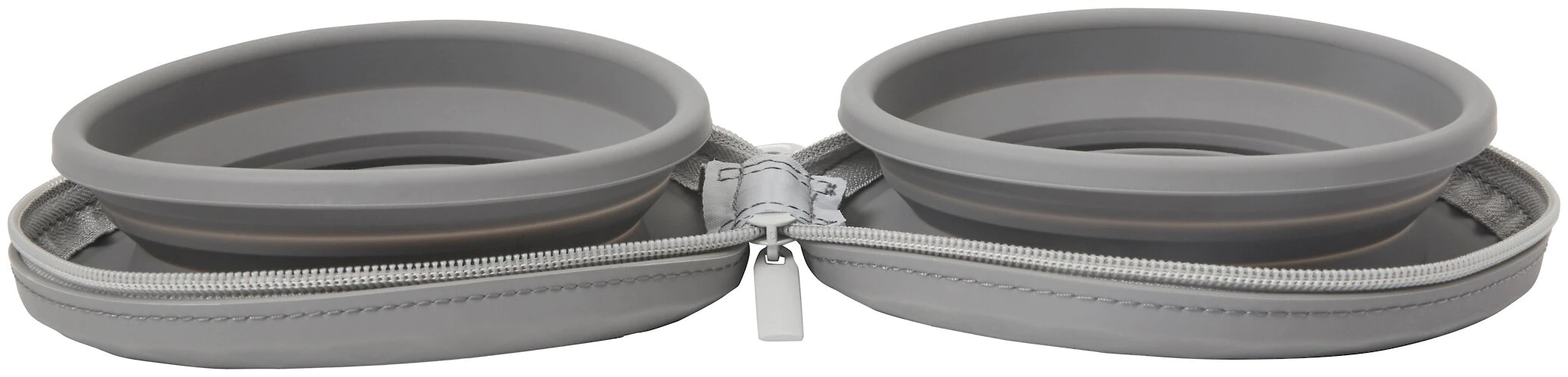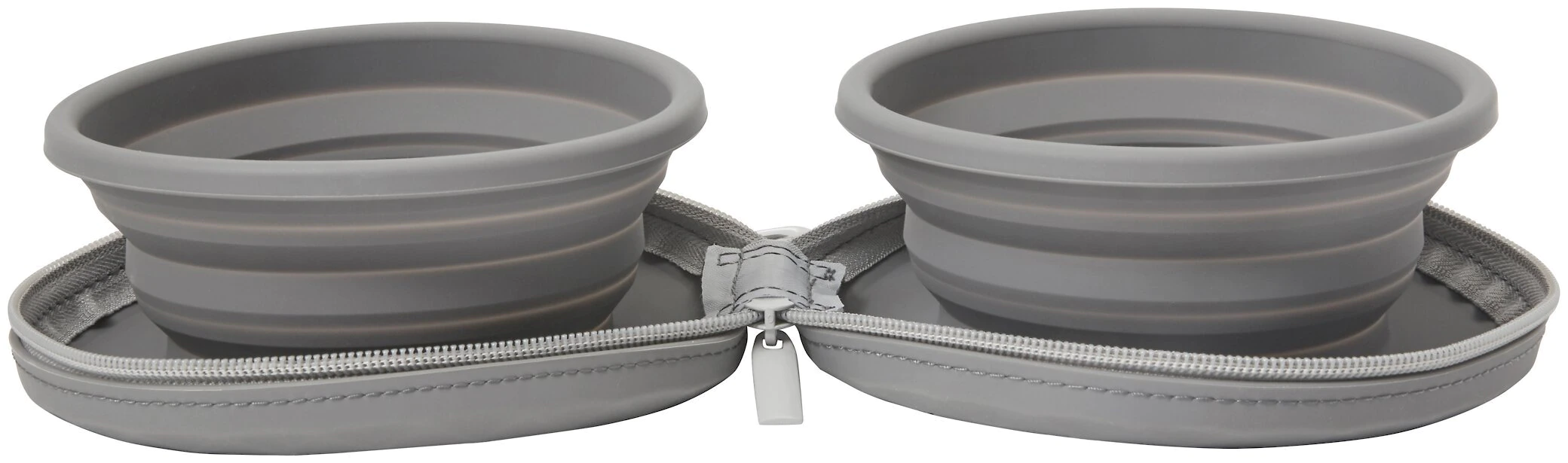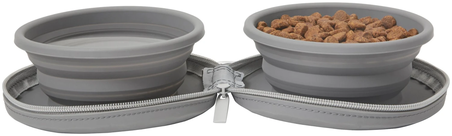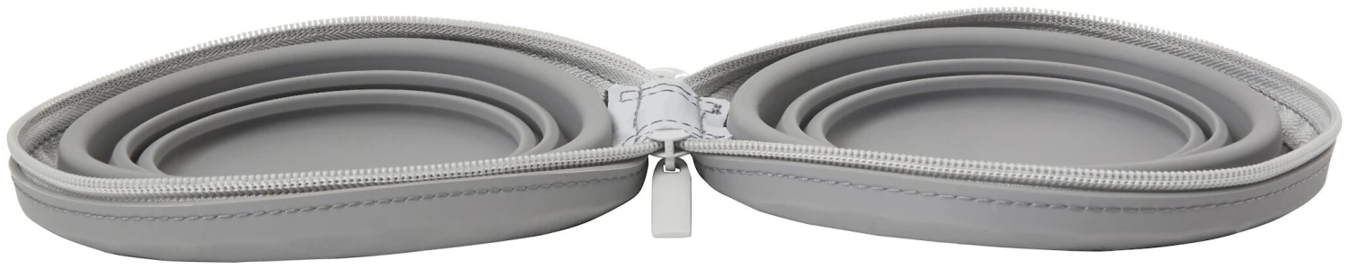 - One set of two collapsible travel bowls that fold up and zipper shut.